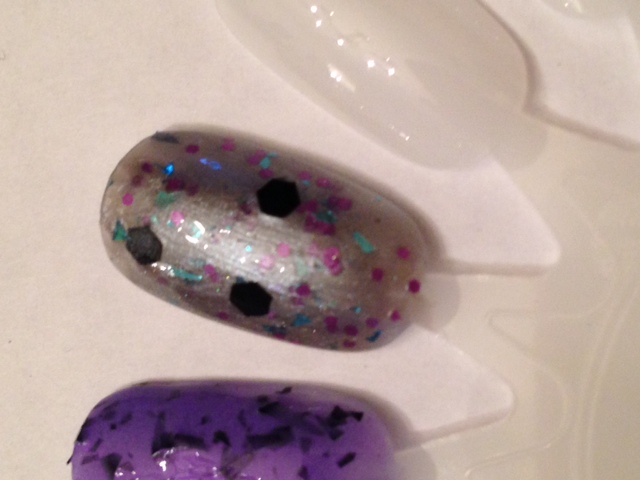 metallic silver base with small purple glitters, large black glitter and teal shreds