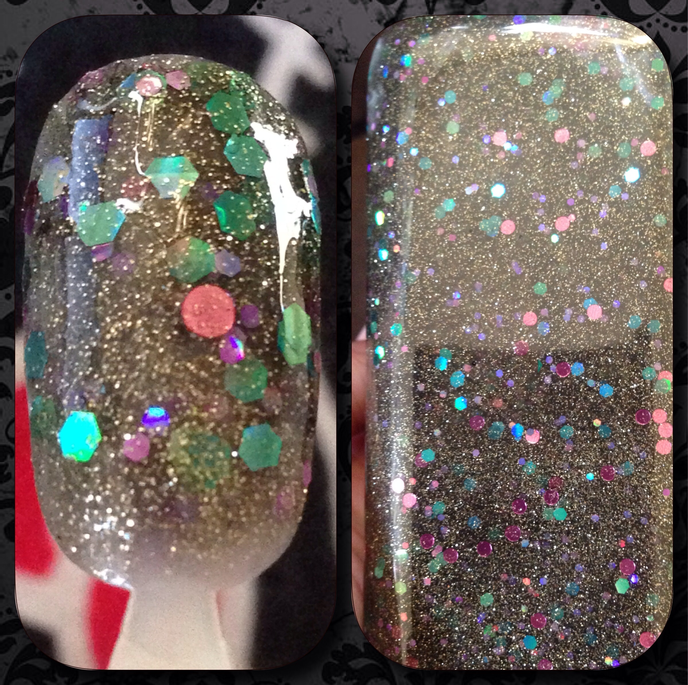 Dark grey based jelly polish with gold micro glitters mixed with purple, turquoise and pink circle and hex glitters.